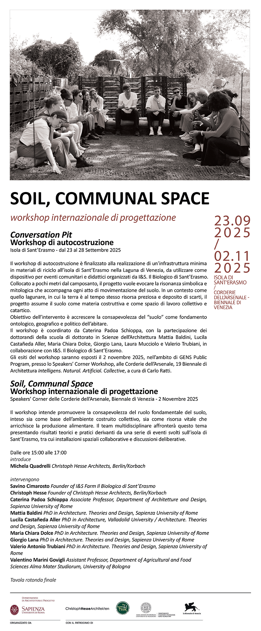 La giornata di Workshop presso le Corderie dell'Arsenale, espone gli esiti finali di un workshop multidisciplinare, svolto all'isola di Sant'Erasmo da maggio a settembre 2025. In particolare il gruppo di dottorandi, coordinati dalla prof.ssa Padoa Schioppa, ha progettato e messo in opera l'installazione temporanea "Conversation Pit" presso l'azienda i&s, Il Biologico di Sant'Erasmo.