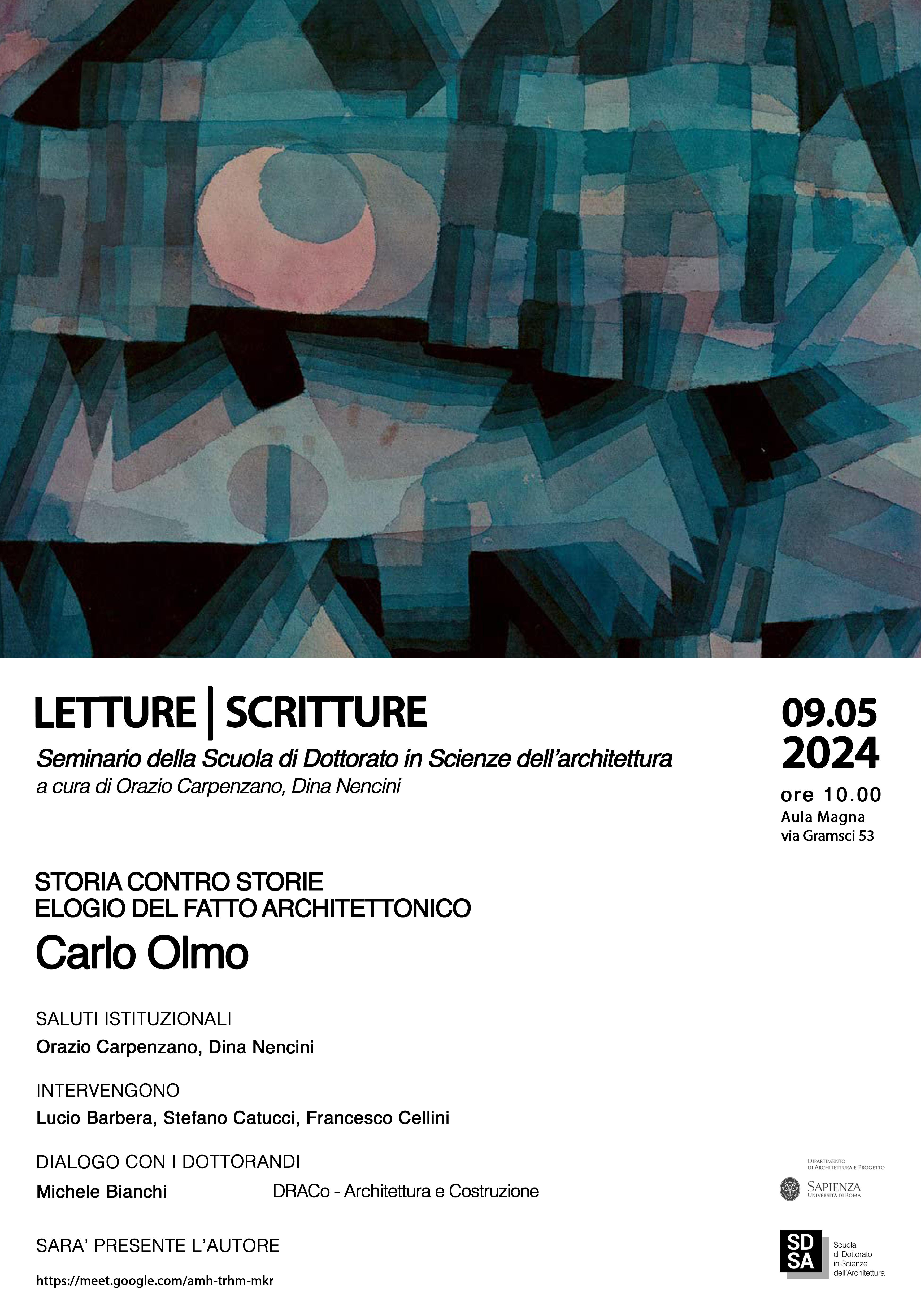 Seminario del Dottorato in scienze dell'Architettura Carlo Olmo, Storia contro storie: Elogio del fatto architettonico il9 maggio 2024 alle ore 10.00 Aula Magna Via Gramsci 53.