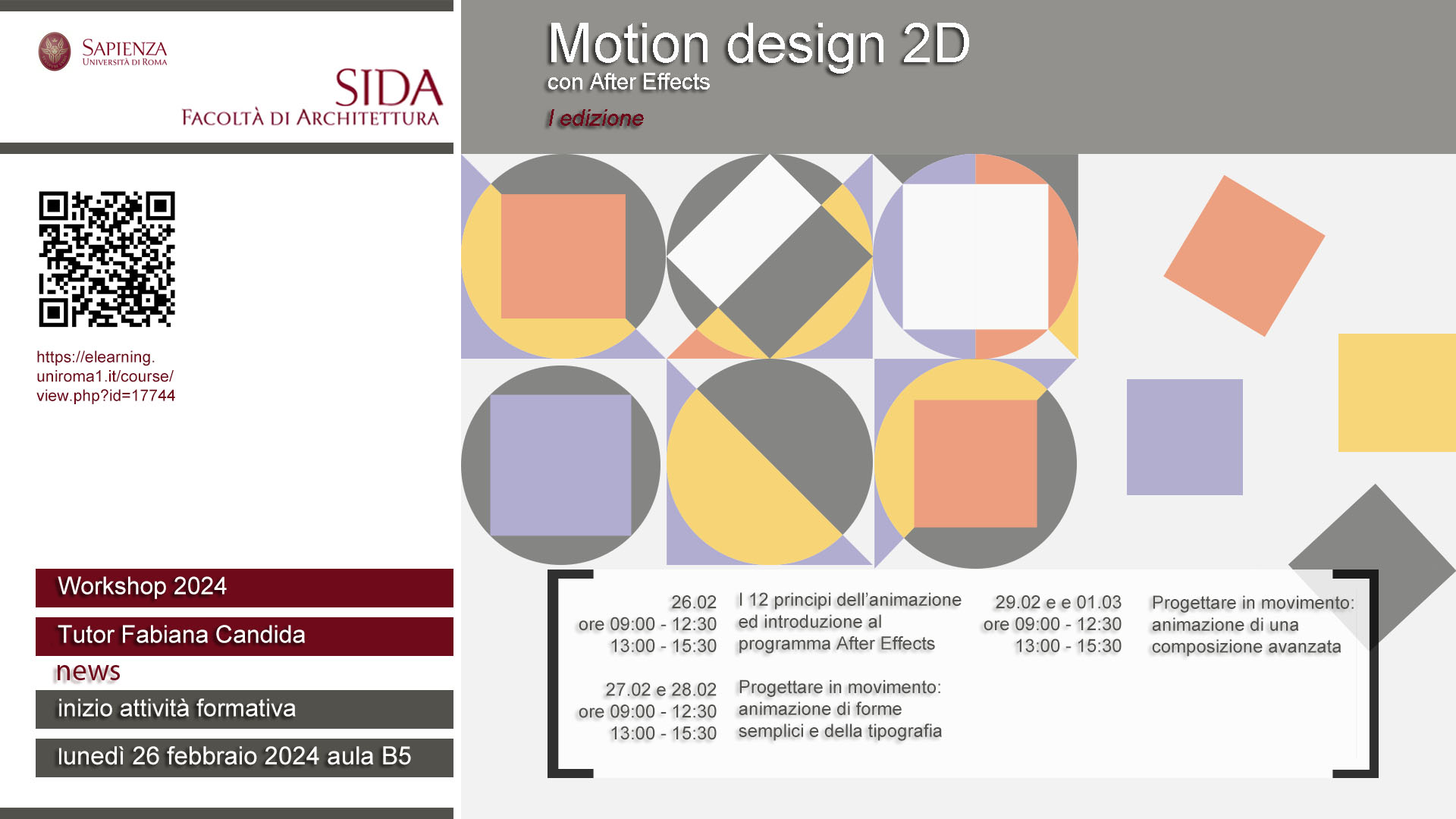 seconda dedicata alla costruzione e alla manipolazione della grafica animata. Attraverso comunicazioni di carattere teorico ed esercitazioni pratiche saranno introdotti i fondamenti dell’animazione grafica bidimensionale con l’obiettivo di imparare a generare e animare forme geometriche e tipografia. Acquisite le competenze di base sarà dedicato spazio alla progettazione di composizioni animate di geometrie con complessità di animazione crescente.