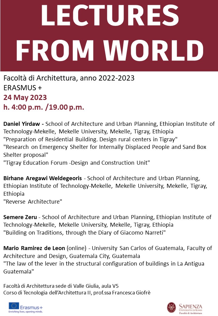 Daniel Yirdaw -School of Architecture and Urban Planning, Ethiopian Institute of Technology-Mekelle, MekelleUniversity, Mekelle, Tigray, Ethiopia"Preparation of Residential Building. Design rural centers in Tigray""Research on Emergency Shelter for InternallyDisplaced People and Sand Box Shelter proposal""TigrayEducation Forum -Design and Construction Unit"BirhaneAregawiWeldegeoris - School of Architecture and Urban Planning, Ethiopian Institute of Technology-Mekelle, MekelleUniversity, Mekelle, Tigray, Ethiopia"Reverse Architecture"SemereZeru- School of Architecture and Urban Planning, Ethiopian Institute of Technology-Mekelle, MekelleUniversity, Mekelle, Tigray, Ethiopia"Building on Traditions, through the Diary of Giacomo Narreti"Mario Ramirez de Leon (online) - University San Carlos of Guatemala, Faculty of Architecture and Design, Guatemala City, Guatemala"The law of the lever in the structural configuration of buildings in La Antigua Guatemala"Corso di Tecnologia dell’Architettura II, prof.ssa Francesca Giofrè