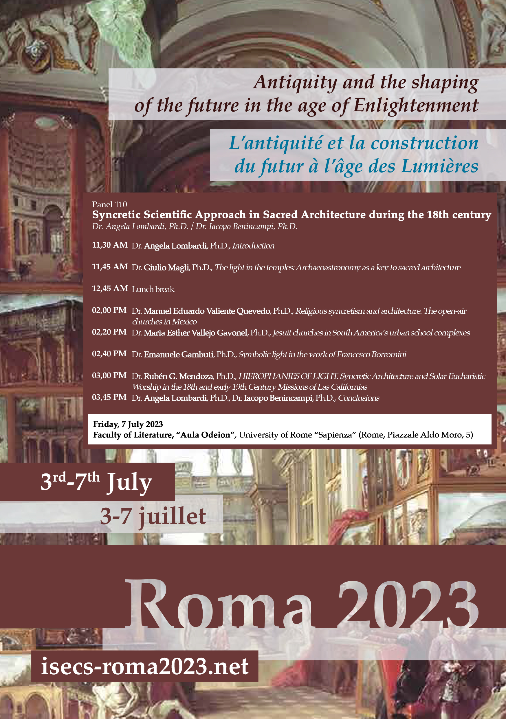 The panel 110, Syncretic Scientific Approach in Sacred Architecture during the 18th century aims to welcome proposals that provide original contributions on the adoption of archaeoastronomy in the development of sacred architecture and settlements, reflecting a syncretic approach towards Antiquity and other diverse cultures. Astronomical knowledge was a relevant design tool in Classical times: Vitruvius developed the book IX on astronomy, both for practical and symbolic reasons. It was utilized to identity wind, equinoctial and solstitial directions as well as the quality of lights in interior spaces. Sun was also associated to sacred power. We welcome papers with an interdisciplinary approach on the application of archaeoastronomical practices in relation to the new evangelization requirements promoted by the Catholic Church during 18th century. Of particular interest will be cases in which a scientific syncretic approach informs the architecture, shaped intentionally by the overlapping of local cultures, earlier traditions, and eventually other diverse influences. Examples of syncretism are identifiable both in Europe and in the new world, thanks to the commitment of religious orders. Si- milar phenomena are visible in Rome as well as in California and Texan Franciscan missions: the churches and their placement on the site were designed applying updated astronomical mathema- tics. The sunlight spotlights specific areas on predetermined days and times, synchronizing diurnal rhythms to the principal feast days of the liturgical year and following seasonal changes. In this way, the European catholic believer and the indigenous catechu- men could experience a divinized world, coinciding both with a classical inheritance and the aboriginal calendrical systems.